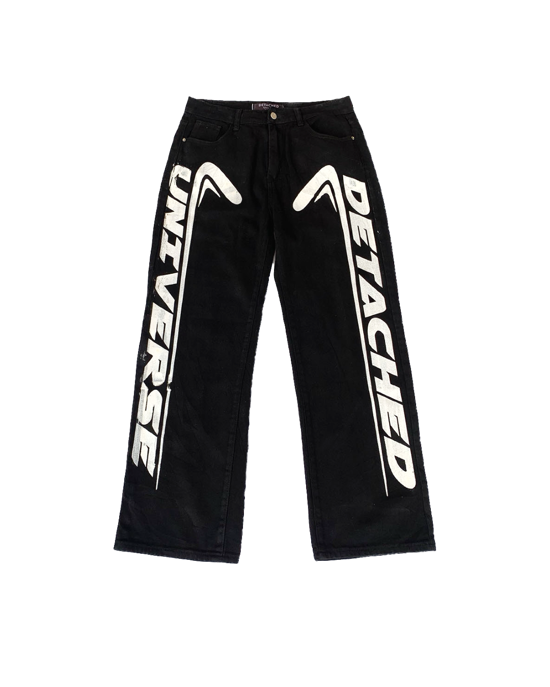 A staple reimagined — the Denim Edge Black (DEB) combines timeless black denim with bold, oversized graphics for a fearless streetwear statement. Featuring the signature DETACHED UNIVERSE print in striking white, these jeans fuse minimal tones with maximum impact.